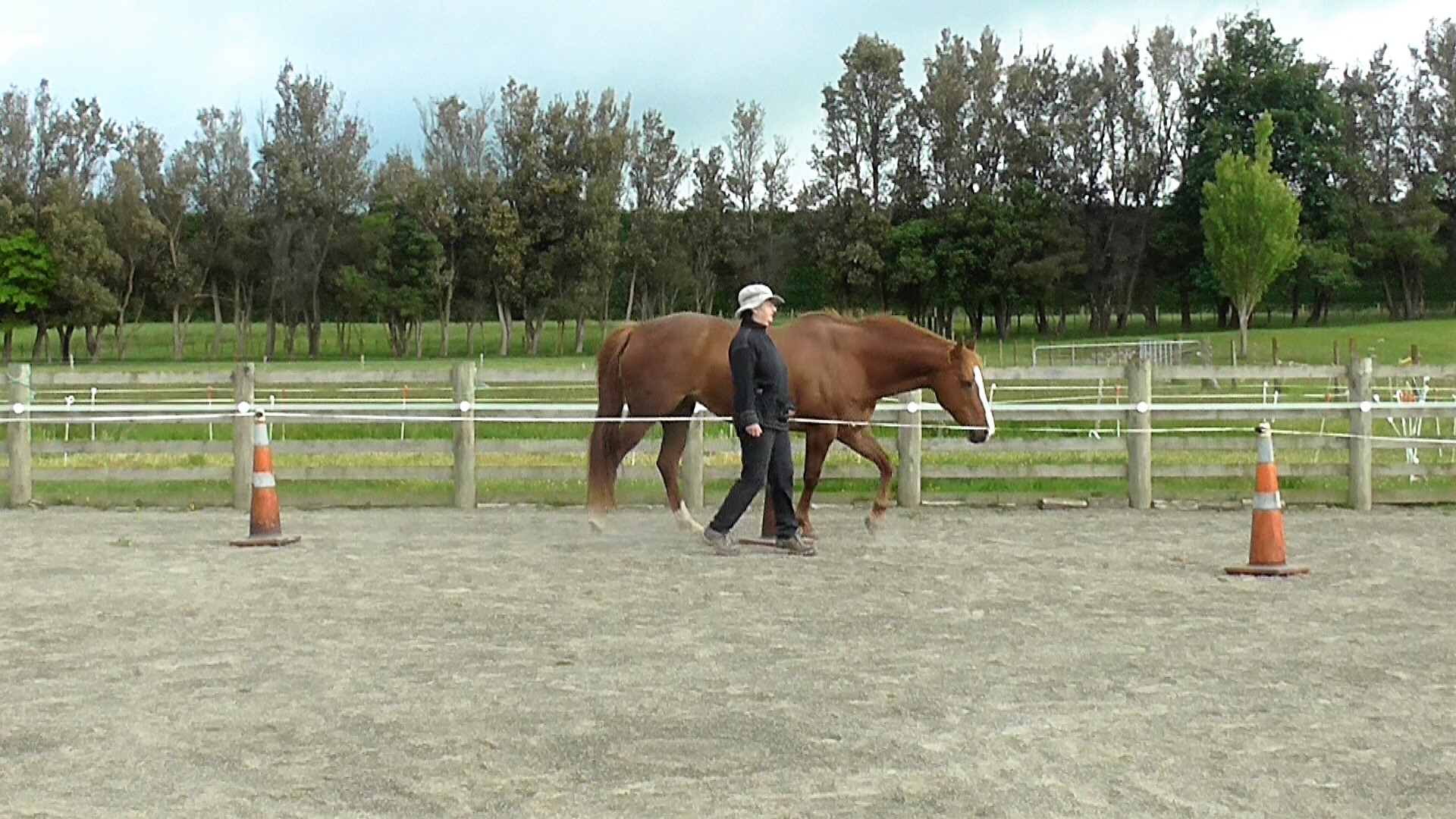 Be sure to teach this walking on either side of the horse. One side may be easier. Start again from the beginning (along a fence or in a lane) for the second side. Some horses easily transfer new learning to the other side. Other horses find everything harder on one side.