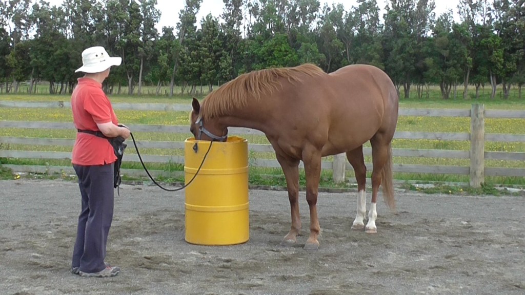 The task above is a good one to prepare a horse for being restricted behind, as in a horse trailer. It is also a task for preparing a horse to back between cart shafts.
