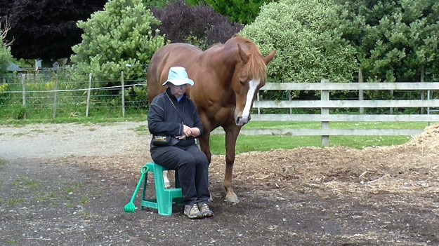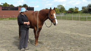 In some cases, it can help to have a halter on the horse, so we can take hold of the side of the halter after the click, giving us some control of where the horse puts his mouth. See the section called ‘Developing Good Table Manners’ that is coming.