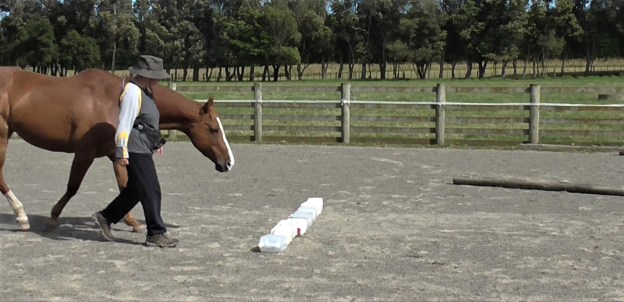 - If you use mat or nose targets, set these out and ask the horse to walk between them, stopping for a click&treat as he reaches each one. Return to LP4 after delivering each treat and ask for the ‘walk on’ with a gentle tap behind the withers.