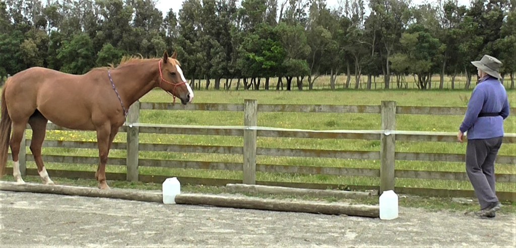 The main concern for the horse when we ride is that most of our body language suddenly becomes invisible to him. Here Boots is intent on targeting the body extension which I’ve left on the ground.