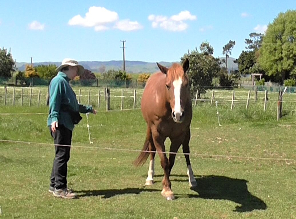I sometimes use a body extension to clarify the task for the horse from a distance. A light touch signal just behind the withers for ‘walk on’, (as well as all the ‘walk on’ body language – big breath in & raised energy, step off with outside leg, voice cue) helps to make our intent clear – ie. we want to stay beside the horse’s ribs while we walk along together. The other use of a body extension is to indicate, by bringing it forward, that we don’t want the horse to turn toward us, but to walk on straight.