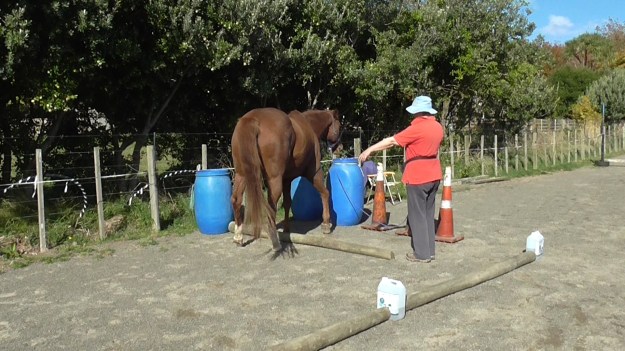 5. Back through increasingly narrow spaces; e.g. two barrels, gates, into and out of stalls, always being careful that the horse does not catch his hip on an upright.