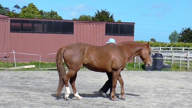There are a couple of ways to approach this task. The slices* outlined below suit a horse who is well used to handling and being rubbed all over. With some horses, it is common sense to build in mobile protected contact* by carrying a body extension*. Once the horse understands the task and the owner is aware of how the horse will respond, using body orientation and hand touch or hand gesture, along with intent, is usually enough of a signal*.