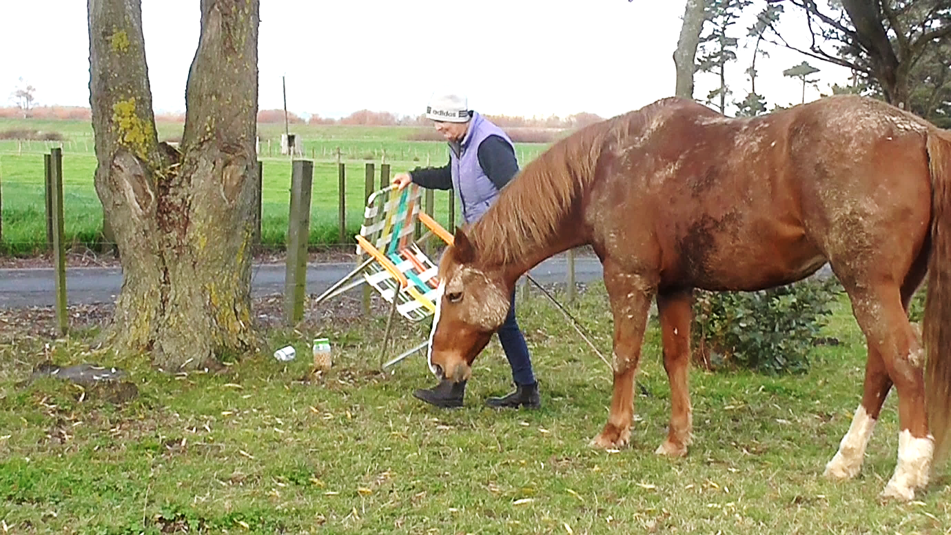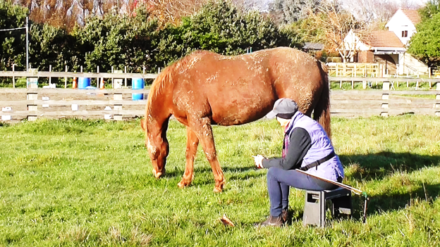 - Turn to face the horse and take up a neutral (no intent) body language position – place both hands flat over your belly button, drop your shoulders and have a soft focus not looking at the horse.