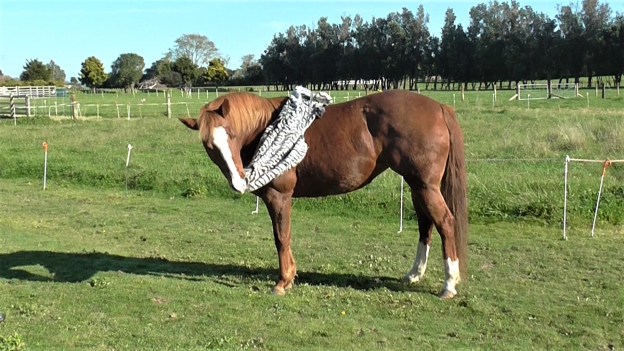The main concern for the horse when we ride is that most of our body language suddenly becomes invisible to him. Here Boots is intent on targeting the body extension which I’ve left on the ground.