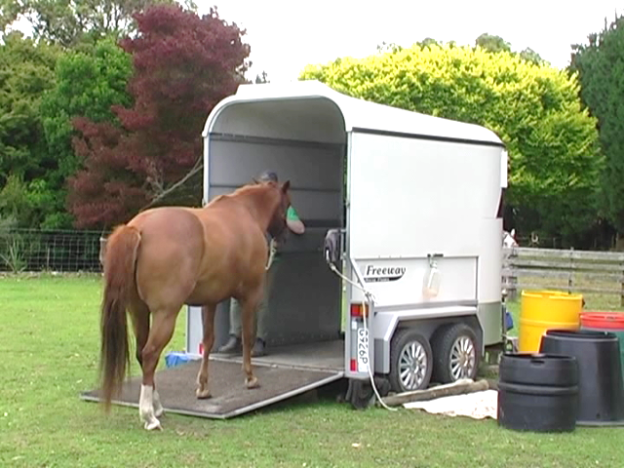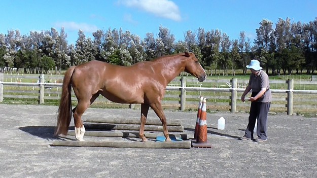 - Horse develops confidence with walking across a rail (or similar).